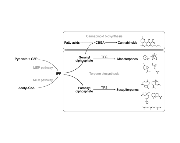 - Bohlmann J., Meyer-Gauen G., Croteau R. (1998). Plant terpenoid synthases. PNAS. - Booth J.K., Bohlmann J. (2019). Terpenes in Cannabis sativa. Plant Science. - Croteau R., Kutchan T., Lewis N. (2000). Natural products biosynthesis. Biochemistry & Molecular Biology of Plants. - Degenhardt J., Köllner T.G., Gershenzon J. (2009). Monoterpene biosynthesis. Phytochemistry. - Gershenzon J., Dudareva N. (2007). The function of terpene natural products. Nature Chemical Biology. - Heil M., Karban R. (2010). Explaining evolution of plant communication. Trends in Ecology & Evolution. - Phillips M.A., Croteau R.B. (1999). Resin-based defenses in conifers. Trends in Plant Science. - Russo E.B. (2011). Taming THC: potential cannabis synergy. British Journal of Pharmacology. - Salehi B. et al. (2019). Therapeutic potential of α-pinene. Biomolecules.