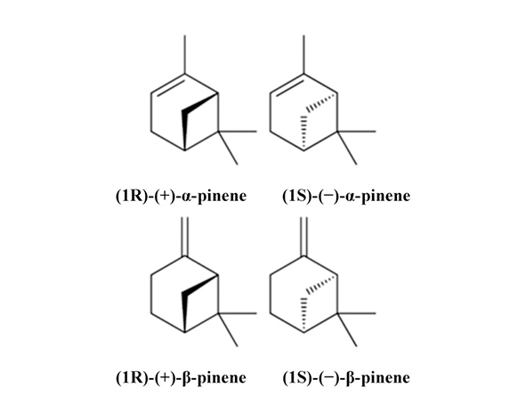 El α-pineno presenta una estructura bicíclica formada por un sistema de anillos fusionados que incluye un doble enlace reactivo, lo que le confiere una notable reactividad química en comparación con otros monoterpenos más lineales. Su fórmula molecular es C₁₀H₁₆ y existe en dos formas enantioméricas principales: (+)-α-pineno y (−)-α-pineno, que pueden diferir en su olor y actividad biológica debido a su interacción diferencial con sistemas quirales. (Bohlmann et al., 1998).