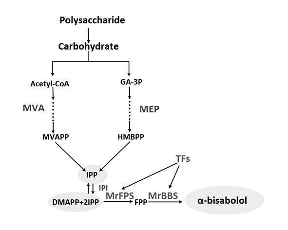 Su biosíntesis se origina a partir del farnesil pirofosfato (FPP), intermediario central en la vía del mevalonato, a través de la acción de sintasas específicas que generan la ciclización característica del bisabolol. Este proceso lo sitúa dentro del mismo marco biosintético que otros sesquiterpenos relevantes en plantas (Degenhardt et al., 2009).