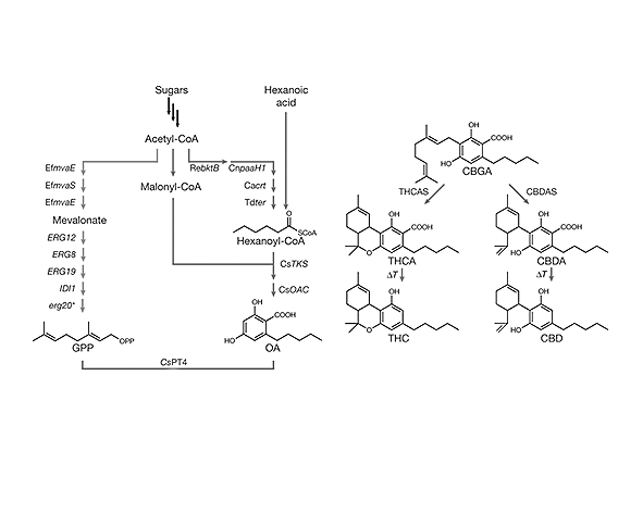 Todos ellos comparten el mismo precursor central (CBGVA), lo que implica que la expresión diferencial de enzimas sintasas determina la proporción final de cada compuesto.