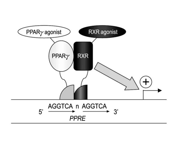 Una vez activado, PPARγ forma un heterodímero funcional con el receptor RXR (Retinoid X Receptor). Este complejo se une a secuencias específicas del ADN denominadas PPRE (Peroxisome Proliferator Response Elements), localizadas en las regiones promotoras de genes diana. La unión al ADN, junto con la interacción con cofactores, modula la maquinaria transcripcional y altera la expresión génica de forma coordinada (Chawla et al., 2001).