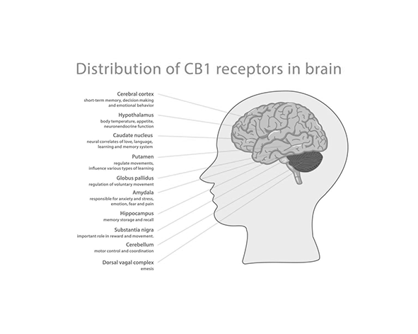 Además del núcleo arcuato, los receptores CB1 se expresan en otras regiones hipotalámicas como el núcleo paraventricular y el hipotálamo lateral, que participan en la regulación neuroendocrina y en la coordinación de respuestas conductuales relacionadas con la alimentación. Esta distribución sugiere que el SEC no actúa sobre un único punto de control, sino sobre una red integrada de núcleos funcionales. (Kirkham, 2009)