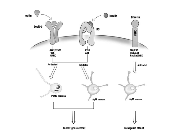 Por su parte, la grelina, considerada una de las principales hormonas orexigénicas, potencia la actividad del SEC, facilitando la activación de circuitos que promueven la ingesta. Esta interacción sugiere que el SEC actúa como un amplificador de señales que indican necesidad energética. (Kola et al., 2008)