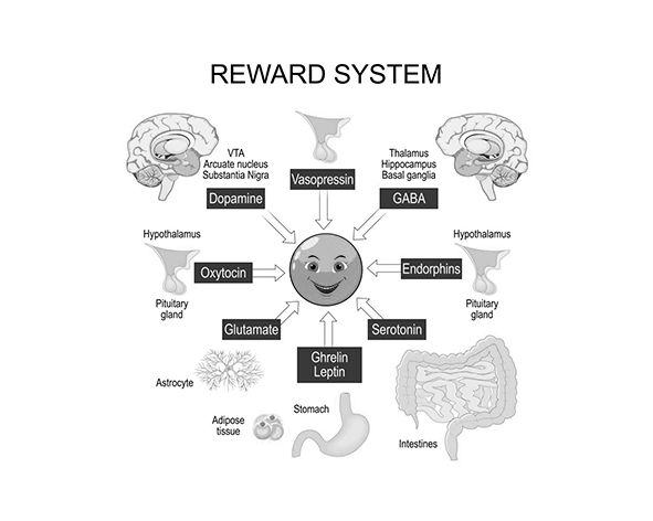 En el ámbito hedónico, el SEC desempeña un papel clave en la valoración del alimento, aumentando la percepción de recompensa asociada a su consumo. A través de su acción en el sistema mesolímbico, potencia la liberación de dopamina y refuerza la motivación por consumir alimentos energéticamente densos, lo que contribuye a la preferencia por determinados tipos de dieta. (Solinas et al., 2008)