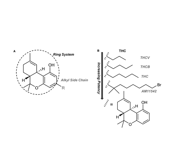 Desde una perspectiva estructural comparada, se ha observado que la reducción de la cadena lateral tiende a disminuir la potencia agonista sobre CB1, lo que ayuda a explicar por qué la THCV presenta un perfil farmacológico distinto al del THC. En modelos experimentales, los cannabinoides con cadenas laterales más cortas muestran una menor eficacia en la activación del receptor, e incluso pueden comportarse como antagonistas funcionales en determinadas condiciones. (Pertwee, 2008)