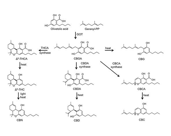 - Pertwee, R. G. (2008). The diverse CB1 and CB2 receptor pharmacology of three plant cannabinoids: Δ9-tetrahydrocannabinol, cannabidiol and Δ9-tetrahydrocannabivarin. British Journal of Pharmacology, 153(2), 199–215. - Morales, P., Reggio, P. H., & Jagerovic, N. (2017). An overview on medicinal chemistry of synthetic and natural derivatives of cannabidiol. Frontiers in Pharmacology, 8, 422. - Di Marzo, V. (2018). New approaches and challenges to targeting the endocannabinoid system. Nature Reviews Drug Discovery, 17(9), 623–639. - Citti, C., Linciano, P., Russo, F., Luongo, L., Iannotta, M., Maione, S., & Vandelli, M. A. (2019). A novel phytocannabinoid isolated from Cannabis sativa L. with an in vivo cannabimimetic activity higher than Δ9-tetrahydrocannabinol. Scientific Reports, 9, 20335. - Berman, P., Futoran, K., Lewitus, G. M., Mukha, D., Benami, M., Shlomi, T., Meiri, D., & Shabat, D. (2018). A new ESI-LC/MS approach for comprehensive metabolic profiling of phytocannabinoids in cannabis. Analytical Chemistry, 90(19), 11705–11713. - Taura, F., Morimoto, S., & Shoyama, Y. (2007). Purification and characterization of cannabidiolic-acid synthase from Cannabis sativa L. Journal of Biological Chemistry, 282(29), 20739–20745. - Sirikantaramas, S., Taura, F., Tanaka, Y., Ishikawa, Y., Morimoto, S., & Shoyama, Y. (2004). Tetrahydrocannabinolic acid synthase, the enzyme controlling marijuana psychoactivity, is secreted into the storage cavity of the glandular trichomes. Plant and Cell Physiology, 45(6), 741–747. - Happyana, N., Agnolet, S., Muntendam, R., van Dam, A., Schneider, B., & Kayser, O. (2013). Analysis of cannabinoids in laser-microdissected trichomes of Cannabis sativa using LCMS and cryogenic NMR. Phytochemistry, 87, 51–59. - Livingston, S. J., Quilichini, T. D., Booth, J. K., Wong, D. C. J., Rensing, K. H., Laflamme-Yonkman, J., Castellarin, S. D., Bohlmann, J., Page, J. E., & Samuels, A. L. (2020). Cannabis glandular trichomes alter morphology and metabolite content during flower maturation. The Plant Journal, 101(1), 37–56. - Wargent, E. T., Zaibi, M. S., Silvestri, C., Hislop, D. C., Stocker, C. J., Stott, C. G., Guy, G. W., Duncan, M., Di Marzo, V., & Cawthorne, M. A. (2013). The cannabinoid Δ9-tetrahydrocannabivarin (THCV) ameliorates insulin sensitivity in two mouse models of obesity. Nutrition & Diabetes, 3, e68. - Riedel, G., Fadda, P., McKillop-Smith, S., Pertwee, R. G., Platt, B., & Robinson, L. (2009). Synthetic and plant-derived cannabinoid receptor antagonists show hypophagic properties in fasted and non-fasted mice. British Journal of Pharmacology, 156(7), 1154–1166. - Mechoulam, R., & Gaoni, Y. (1972). The isolation and structure of Δ1-tetrahydrocannabinol and other neutral cannabinoids from hashish. Journal of the American Chemical Society, 94(17), 6159–6165. - Mechoulam, R., & Hanus, L. (2000). A historical overview of chemical research on cannabinoids. Chemistry and Physics of Lipids, 108(1–2), 1–13.